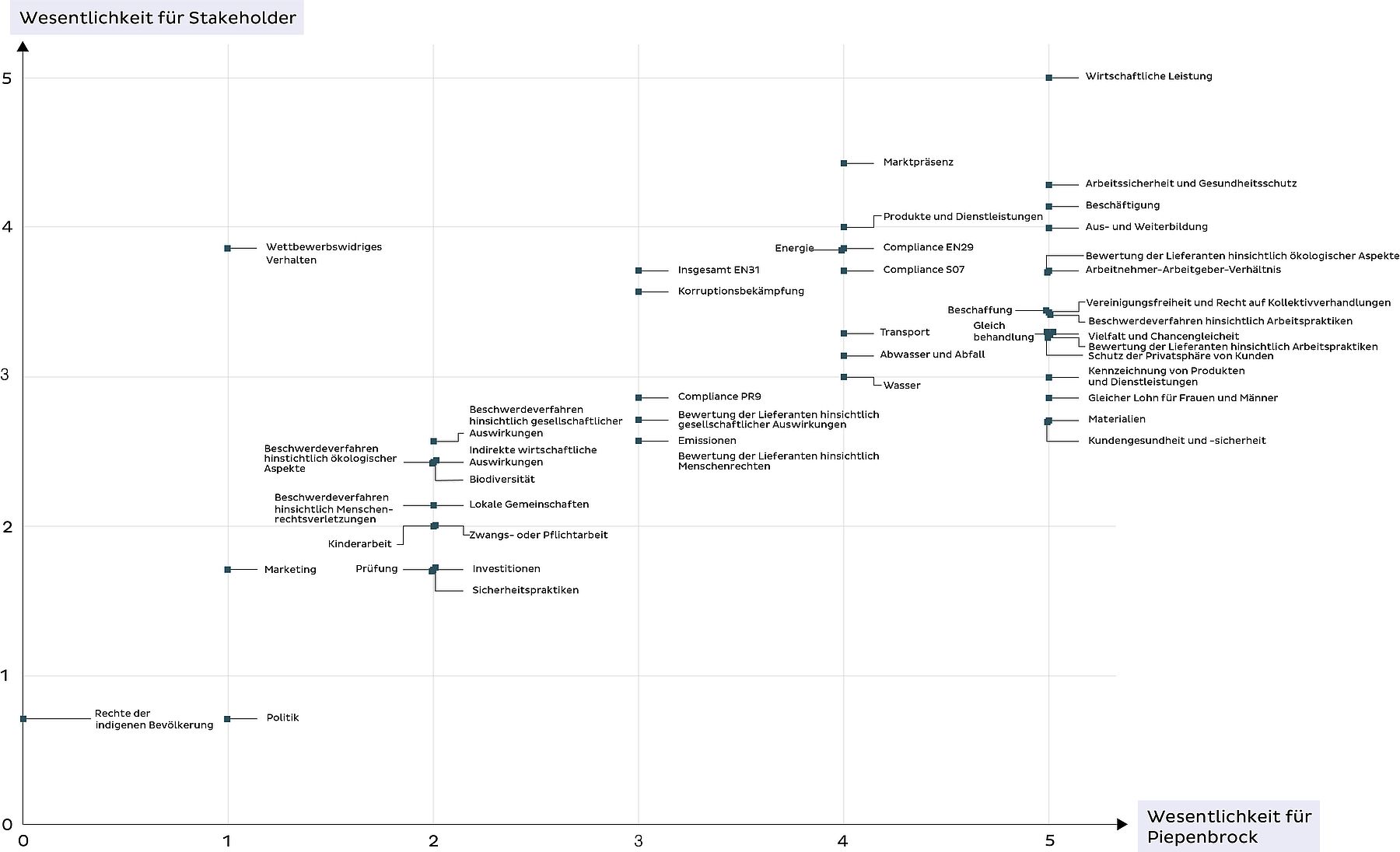 Zur Ermittlung der Stakeholder-Erwartungen wurden zunächst im Rahmen eines strukturierten Auswahlverfahrens die Vertreter der wichtigsten Interessengruppen definiert. Anschließend wurden mit diesen Tiefeninterviews geführt. Die Interessen der Piepenbrock Unternehmensgruppe hat der Arbeitskreis Nachhaltigkeit in Interviews mit den Fachabteilungen aufgedeckt. Die aus den Gesprächen mit den Interessengruppen und Fachabteilungen generierten Themen hat der Arbeitskreis Nachhaltigkeit nochmals selektiert und gebündelt – unter Berücksichtigung der GRI-Richtlinien – sowie in einer Wesentlichkeitsmatrix priorisiert. Die Matrix zeigt, dass insbesondere die wirtschaftliche Leistung sowohl für die Stakeholder als auch für Piepenbrock eine große Relevanz besitzt. Auch Arbeitgeberfaktoren wie die Arbeitssicherheit und der Gesundheitsschutz, faire Beschäftigungsverhältnisse und Löhne oder die Aus- und Weiterbildungsmöglichkeiten spielen eine Rolle ebenso wie die Lieferantenauswahl hinsichtlich der ökologischen und sozialen Folgen. Außerdem sind die Compliance-Kultur und Korruptionsbekämpfung sowie das Thema Energie für alle Interessengruppen bedeutend. Dahingegen spielt das Verhalten im Wettbewerb für die Stakeholdergruppen eine wichtigere Rolle, während die Aspekte Emissionen sowie Kundengesundheit und -sicherheit für Piepenbrock bedeutender sind.