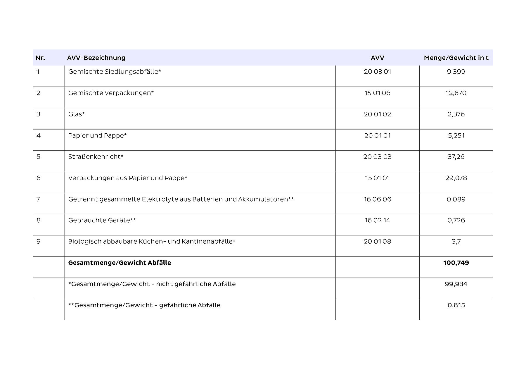 Wir setzen auf die konsequente Abfalltrennung, um eine möglichst hohe Verwertungs- und Recyclingquote sicherzustellen. Für die fachkundige Entsorgung von Abfällen arbeiten wir grundsätzlich mit lizenzierten und regelmäßig zertifizierten Entsorgungsfachbetrieben zusammen. Schulungen und Informationen sollen das Bewusstsein für ressourcenschonendes Handeln an den Standorten und Niederlassungen fördern (z.B. Senkung des Papierverbrauchs, saubere und korrekte Trennung des Mülls, etc.).